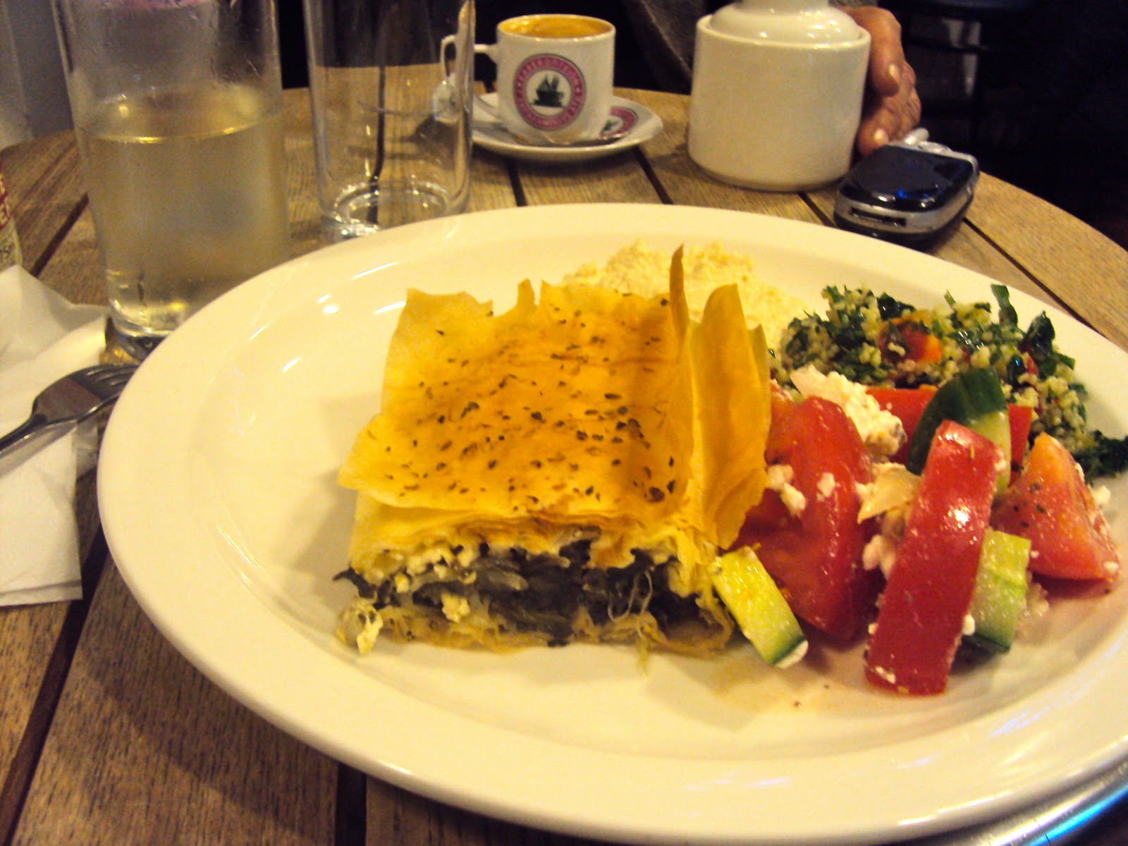 Finished work at eight then dashed into Manos and met 'A' for a quick bite and a ginger beer.... lovely Spanakopita which is a fillo, feta, herb and spinach pie. It was served with humus, Greek salad and a quinoa salad. Amazing food and it's very cheap the main course only £6.10!....Remember the chocolate orange cake I told you about...